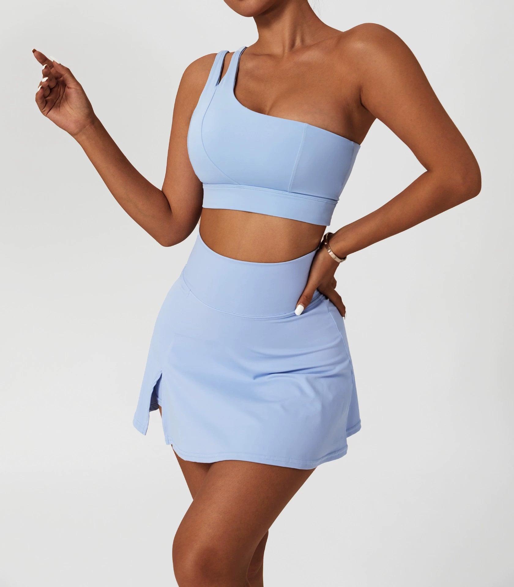 -Description: The angled shoulders reveal a sexy collarbone, built-in chest pads, and a safety lining inside the skirt to prevent it.